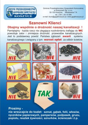 Gminne Przedsiębiorstwo Gospodarki Komunalnej w Koszycach informuje, że wobec właścicieli posesji, u których zostanie stwierdzone nielegalne podłączenie wód opadowych do kanalizacji sanitarnej będą wyciągane stosowne konsekwencje. Czytaj więcej…
